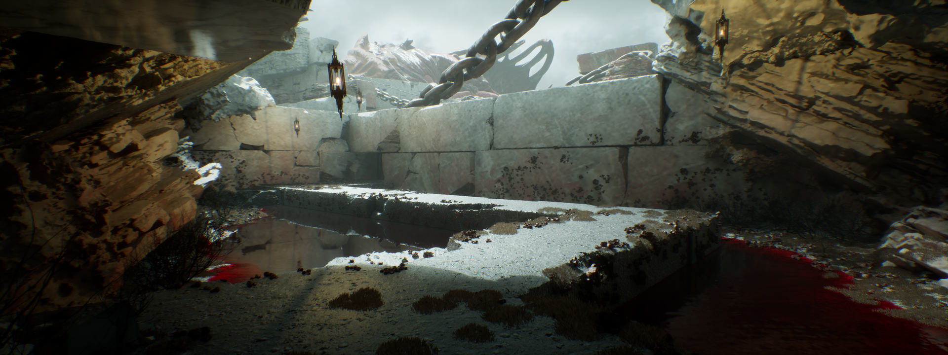 The game features two key worlds. The first is the "Other World", a fantastical realm introduced in the prototype. It includes dramatic elements like a slain Titan and a village, with visuals that play on size, scale, and visceral imagery.